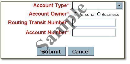 You will now be asked to enter your bank account information, including your account and routing numbers. It would be helpful to have a copy of one of your checks handy before reaching this stage. Click SUBMIT after completing the boxes. |